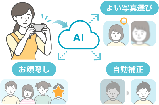 とりんく独自の技術による子どもの顔を正確に認識するAIを用いて、写真業務をサポートする便利な機能を多数搭載。