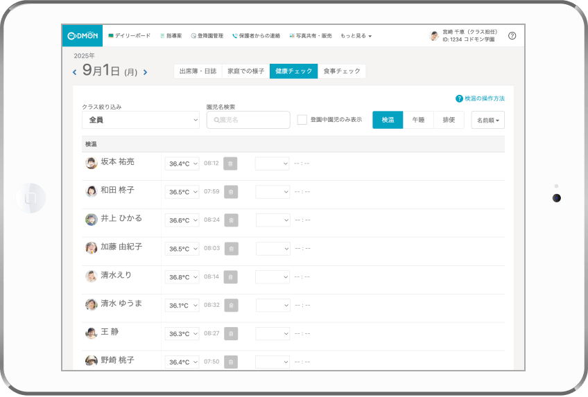 日々の園児別の健康記録(午睡・検温・排便・食事)をタブレットやスマートフォンで