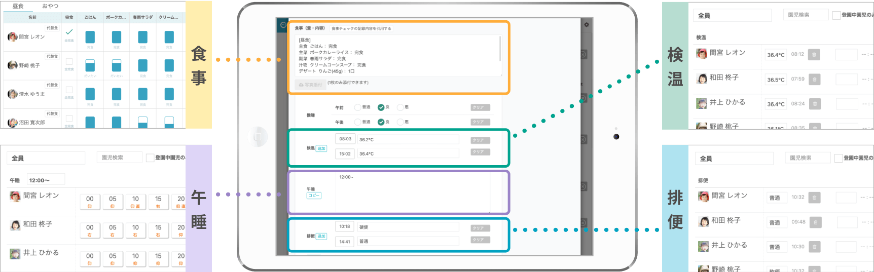 食事・検温・午睡・排便などの各種記録は、連絡帳に自動転記されます。