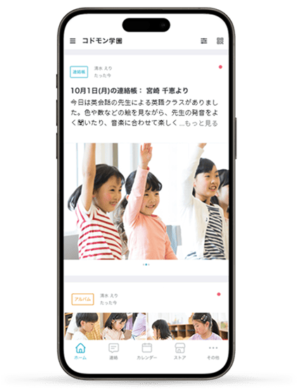 連絡帳、出欠連絡、お知らせ一斉配信、アンケートなど多数の機能を揃えており、全国の施設、保護者にご利用いただきながら日々機能改善を行っています。